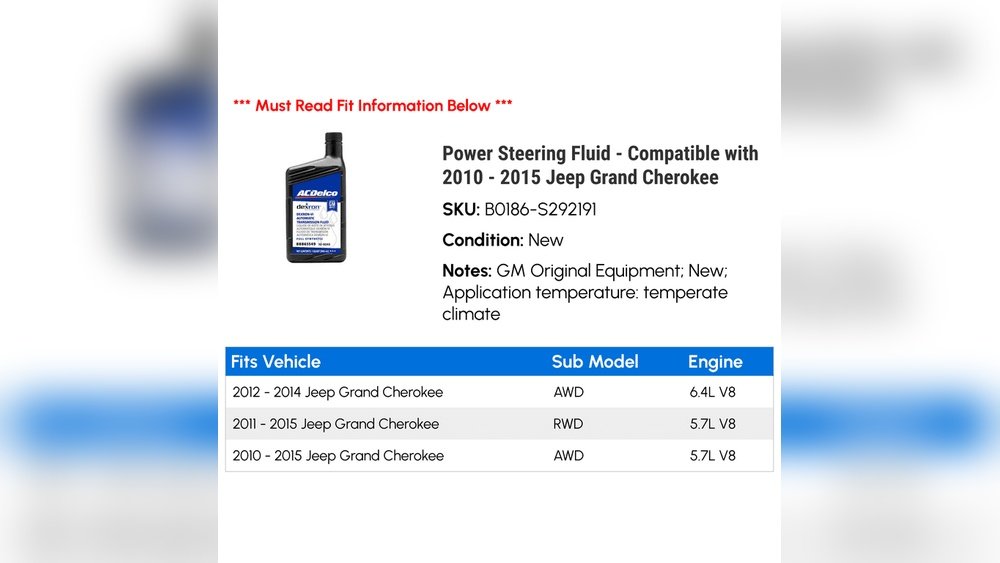 Make sure to check the label and confirm compatibility with your 2015 Jeep Grand Cherokee. Avoid mixing different fluid types to prevent damage. Many aftermarket fluids are available at auto parts stores such as AutoZone and Walmart, making them convenient to purchase.